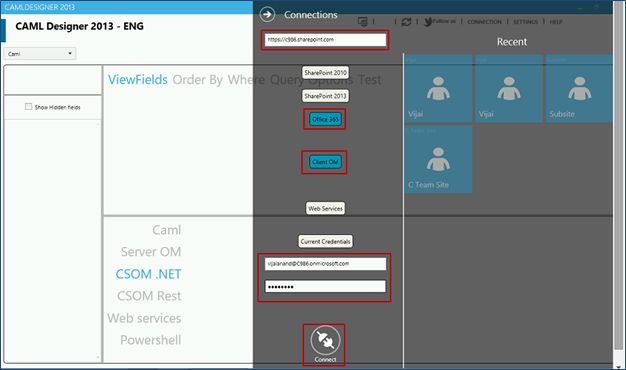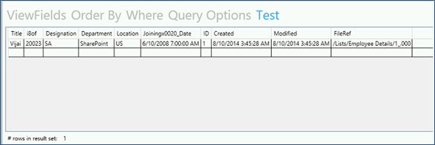 Download:You can download CAML Designer 2013 from http://www.biwug.be/.CAML Designer 2013 to build queries from Office 365 SharePoint listIn this article you will see how to build CAML queries from an Office 365 SharePoint list. I have created a list named “Employee Details” with the following columns and items.ColumnsItemsConnect to Office 365 SharePoint list1. Open CAML Designer 2013.2. Click on the Connection link. Enter the site URL, select Office 365, select Client OM. Enter the credentials and then click on Connect.3. Successfully connected to the Office 365 SharePoint site. 4. Click on the Employee Details list. 5. Click on the ViewFields link and select the fields to be viewed.6. Click on the Order By link and select the field.7. Click on the where link and configure the conditions for the query. I want to retrieve the data based on the following conditions.8. Click on the Query Options link, you have the following options to query the SharePoint list. I have set the row limit for the query as shown below.9. Click on the Test link. You will be able to see the query results as shown below.10. Apart from CAML query you will be able to get the code snippets for the following.Server OM: CSOM .NET:CSOM Rest:Web Services:Powershell:SummaryThus in this article you saw how to query an Office 365 SharePoint list using CAML Designer 2013.