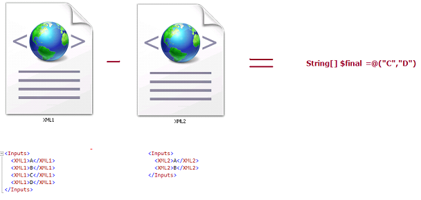 [String[]] $final=@($strXML1 | where{$strXML2 -notcontains $_})