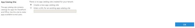 - Specify all the details on the Create App Catalog Site Collection page as shown below. Click on the Ok button.