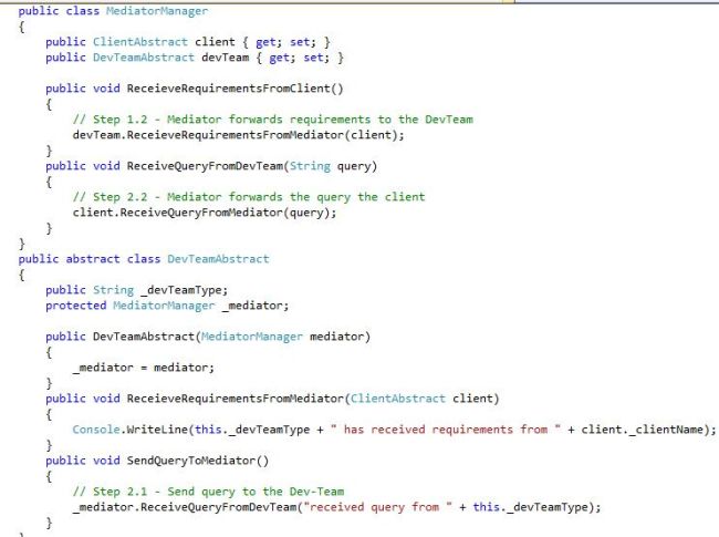 The Mediator will further pass these to the DevTeam, using the reference of the DevTeam it holds, by calling the method ReceieveRequirementsFromMediator(client). This method is in the DevTeam class. The details received by the dev-team, will be displayed on the screen. See the code below.