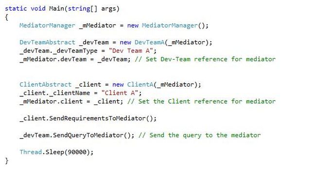 Since we have already set the reference of the mediator for the client and dev-team classes and references of these classes for the mediator in Step 1, we simply need to call the SendQueryToMediator() of the dev-team class. So the client code will be: