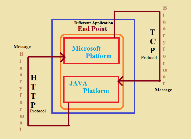 In this figure you can see different types of service endpoint communication in xml binary format using HTTP protocol and TCP protocol.