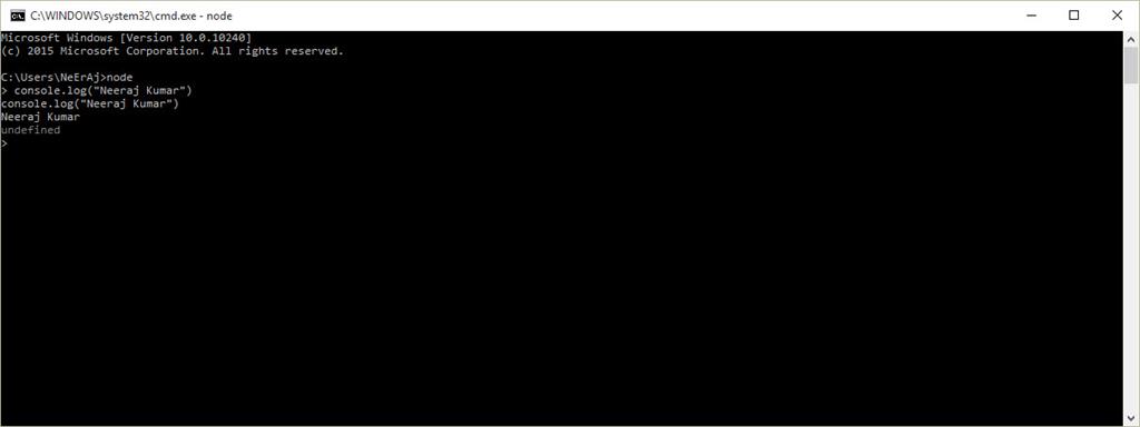 Next, at the Node.js prompt will appear. After the prompt is visible, write the following command: