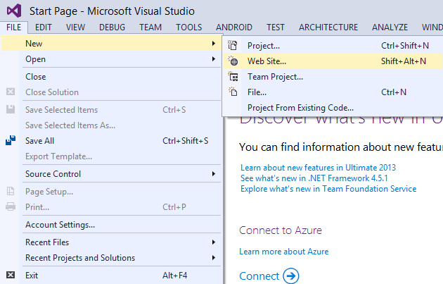 Now we create the website, click on File, tehn go to New and click on the Web Site.