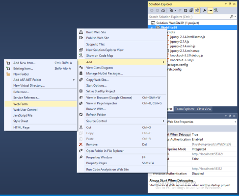 After adding the Knockout.js library, next we need to add the web form to the website by right-clicking and add a web form to the website.