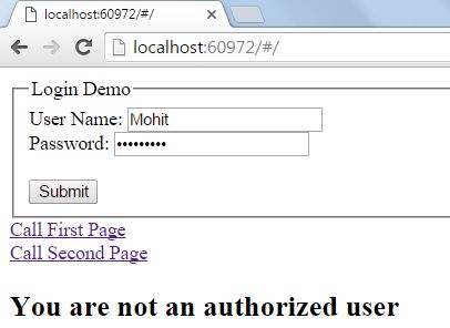 On this page I created two textboxes and a button, which will help to identify user authenticity. Apart from that I have created a div in which some message is written for non-authentic and non-authorized users, and one more div where some links and a container div is created.