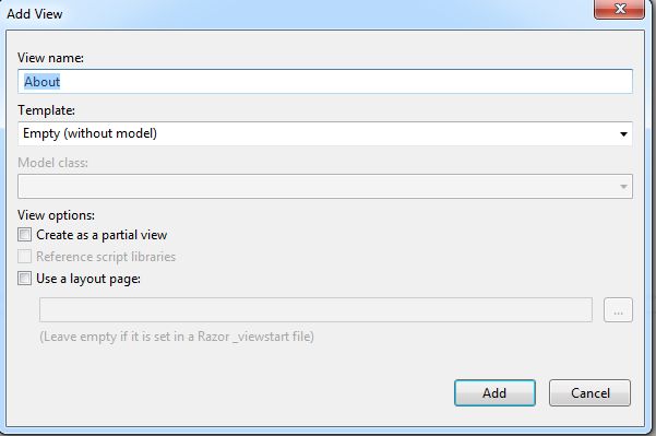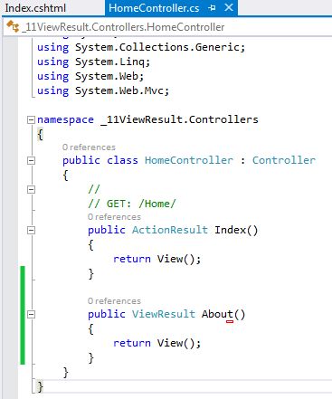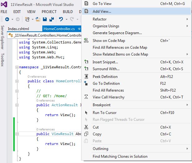 IntroductionThis article shows how to use view result in a Controller in MVC.Step 1Create a MVC project from the "Empty" template.Right-click on "Controllers" and select "Add" >> "Controller...".Step 2Select "MVC 5 Controller - Empty" to add an empty Controller.Click on the "Add" button.Step 3Name the Controller as in the following:Step 4Now we need to create a view.Right-click on "Index" and select "Add View...".Step 5Name the view and select "Empty (without model)" as the template.Click on the "Add" button.Step 6Add a title in the index page.Step 7ViewResult represents a class that is used to render a view by using an IView instance that is returned by an IViewEngine object. View() creates an object that renders a view to the response.Step 8Now we need to create a view.Right-click on "About" and select "Add View...".Step 9Name the view and select "Empty (without model)" as the template.Click on the "Add" button.Step 10Add the title in the about page.Step 11Add html.actionlink for about.cshtml.Step 12Run the project, click on the about link and you will see the about page rendered in the browser.<< Day 10 >> Day 12