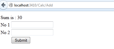 Here we use the HTML <form> element on the page, not a form with runat=server. The action attribute of the form element is set to post data to the add action method of the Calc controller. When we press the submit button, the post will be done. Once it is submitted, from the controller end we get data from the request.