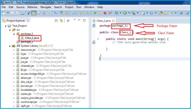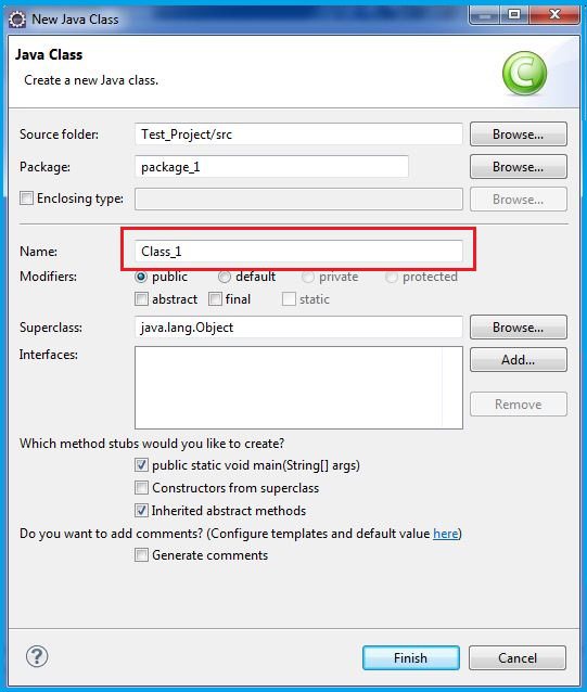 - Now create a Java Class. For class creation, right-click on the Package, "package_1" then select New -> Class and name that class class_1 and click on Finish.