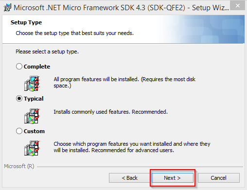 The Microsoft .NET Micro Framework SDK 4.3 setup wizard is open now. Select checkbox Typical and click Next button.