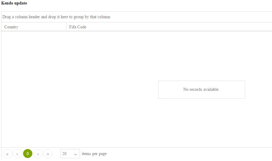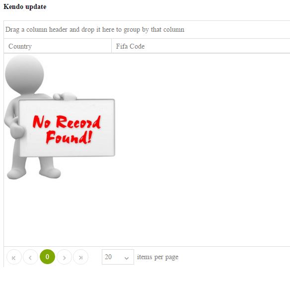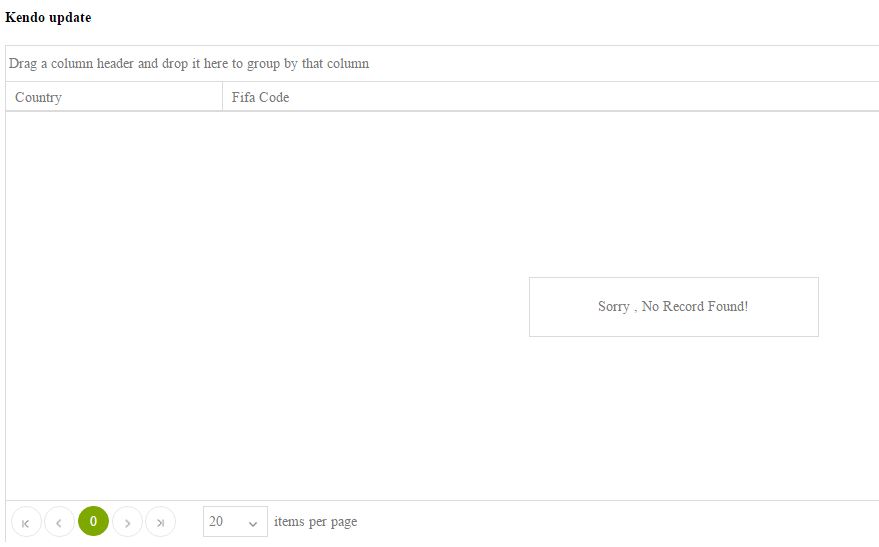 Figure 4 You can see one thing in Figure 4, that is that there is no record to display in the grid, it is the developer's responsibility to show a no record message to the user. Now Kendo gives a new feature called noRecords. It is one of the properties in the Kendo grid to display the no record message.