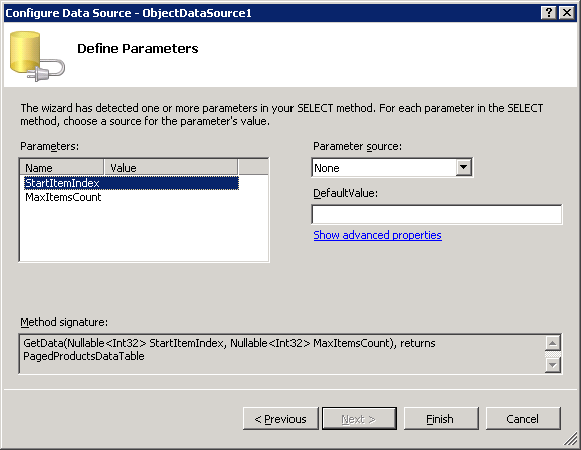Finally the wizard prompts for the sources of the GetData method's StartItemIndex and MaxItemsCount input parameter's value. These parameter values will actually be set by the GridView automatically, thus leave the source set to None and click on the Finish button (see Figure 12).