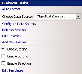 Now let's drag and drop a GridView control from the Data tab in the Toolbox window onto the Web Form page. Click on the smart tag and select Choose Data Source option. Then configure the GridView to support paging by checking the Enable Paging checkbox in its smart tag (see Figure 13).