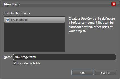 3. Create some place holder pages that we can navigate to. In Expression Blend, go to the project view, click on the project and select add new item. Call the item Nav1Page.xaml and leave the "Include code file" check box checked. Repeat for Nav2Page.xaml and Nav3Page.xaml. On Nav1Page.xaml add a text block with the words "Nav1Page place holder". Repeat for Nav2Page and Nav3Page changing the stated text as appropriate.