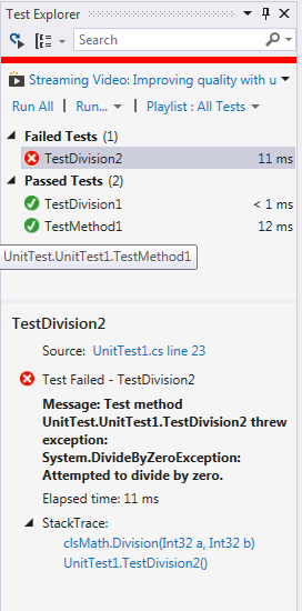 Now if we run the tests then TestDivision2 will fail and give a
