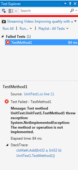 Or by test explorer (select Test, Windows, then Test Explorer). Our test will fail since we don’t have any implementation in the function.
