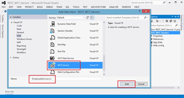 Now right-click on the project in the Solution Explorer then select Add New Item then select WCF Service and provide the the name "EmployeeService".