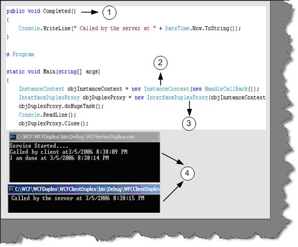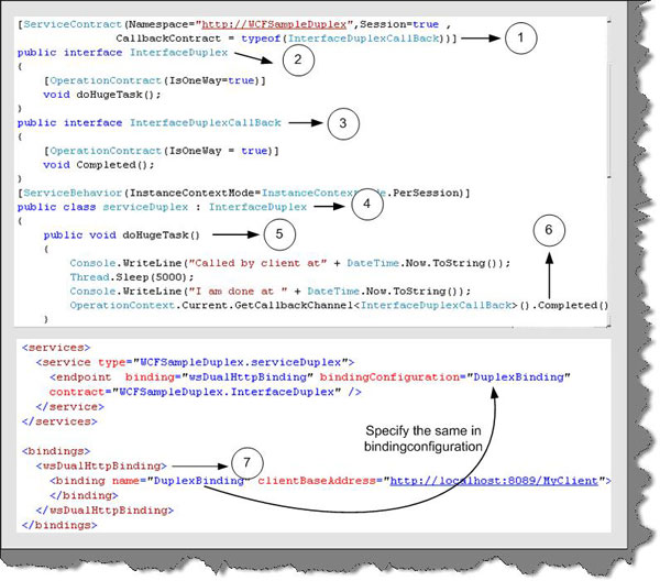 Let us try to understand the duplex concept by doing a small sample. The code snippet is as shown in the above figure. We will extend the previous sample, which was shown in the first question only that now we will provide the notification to the client once the doHugeTask is completed.