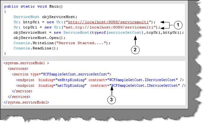 1 and 2 - As we are hosting the service on two protocols we need to create two objects if the URI. You can also give the URI through config file. Pass these two objects of the URI in the constructor parameter when creating the service host object.