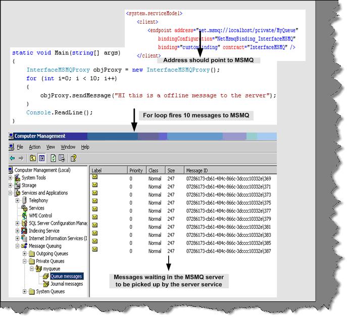 Therefore, what you do is deploy a MSMQ server and let the clients post message to this MSMQ server. When your actual server runs, it just picks up the message from the queue. In short, neither the client nor the server needs to be up and running on the same time. In WCF we have a client and service model and in real world it is very much practical possible that both the entities will not be available at one time.