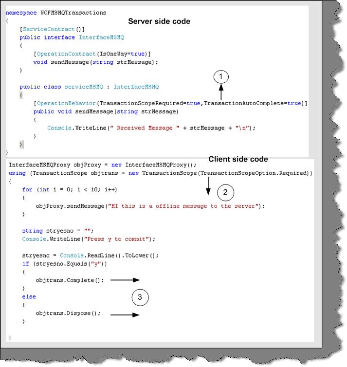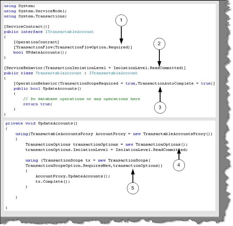 3 - This defines the transaction behavior with in the service. [Operation Behavior] has a property called as transaction scope. Transaction Scope setting indicates that operation must be called within a transaction scope. You can also see TransactionAutoComplete is set to true which indicates that transaction will complete by default if there are no errors. If you do not provide the TransactionAutoComplete to true then you will need to call OperationContext.Current.SetTransactionComplete() to make the transaction complete.